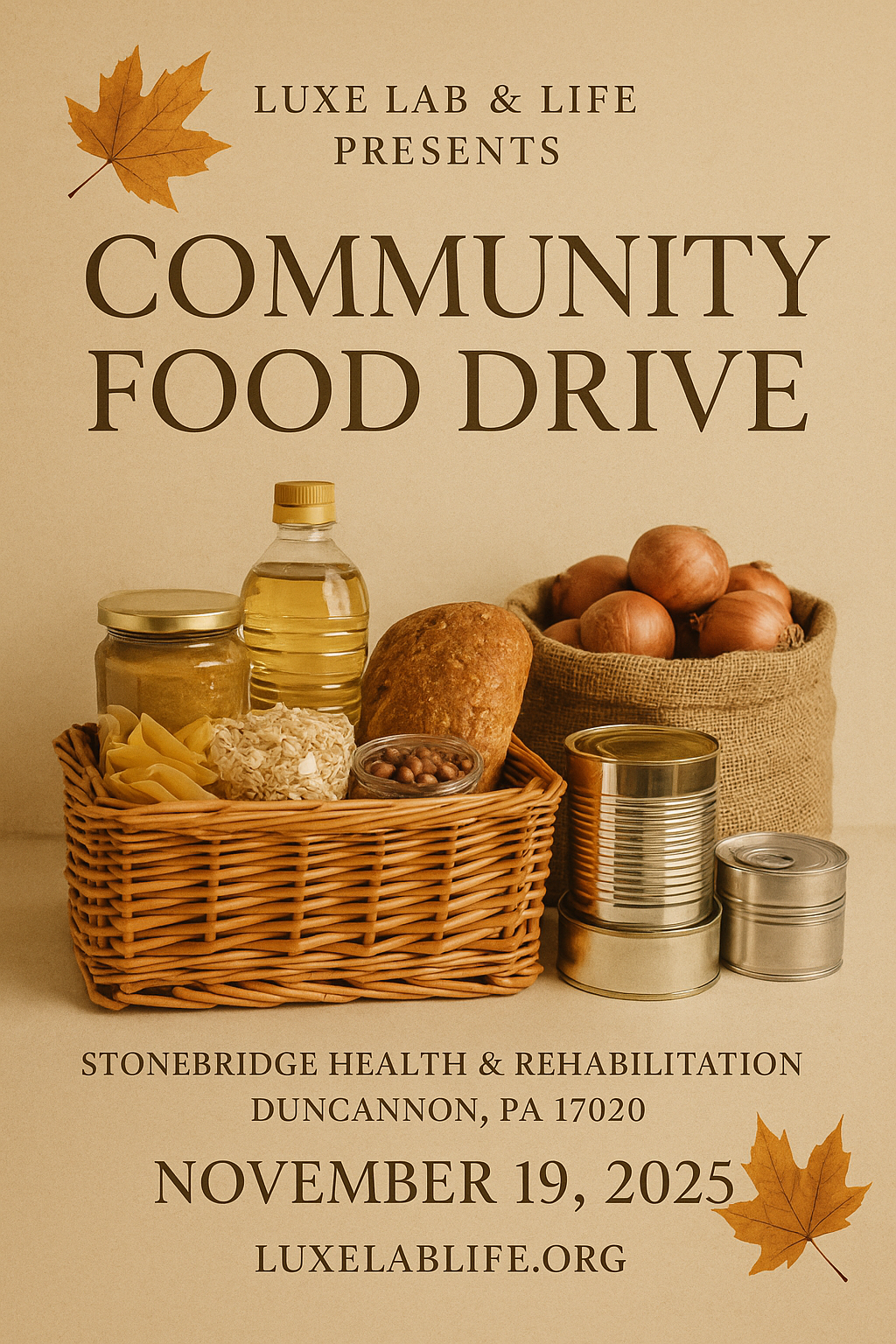 Join Luxe Lab & Life on November 19, 2025, at Stonebridge Health & Rehabilitation in Duncannon, PA, for our annual Community Food Drive. We’re coming together to collect non-perishable items and support families in need this holiday season — because giving back is always in style.