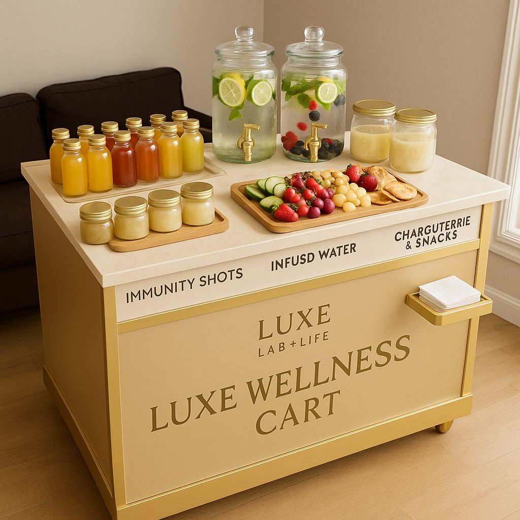 A signature Luxe experience designed to nourish body and mind. Our Wellness Cart brings handcrafted charcuterie boxes, infused teas, and refreshing wellness treats directly to your events, offices, or community spaces — blending health, elegance, and indulgence in every detail.